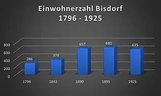 Mit der wirtschaftlichen Entwicklung verdoppelte sich in den Jahren zwischen 1796 bis zur Eingemeindung Bisdorfs nach Borne im Jahr 1937 auch die Einwohnerzahl von 286 auf 635 (durch die Zusammenlegung mit Borne 1937 endeten auch gesonderte statistische Angaben für Bisdorf). Dabei wuchs die Bevölkerung in den Jahren zwischen 1842 und 1895 am stärksten, nämlich pro Jahr um durchschnittlich ca. 4,6 bis 5,9 Personen. Nach dem I. Weltkrieg ging die Zahl der Einwohner leicht zurück. Zum 31. Dezember 2024 wurden für Borne (mit OT Bisdorf zusammen) 1.149 Einwohner erfasst.[42]