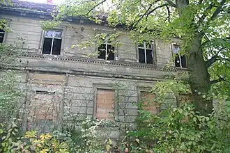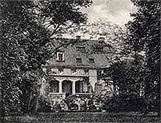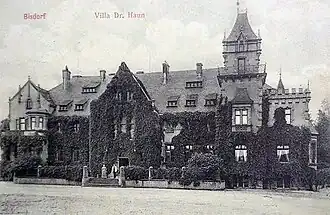 Auch ist der um die Jahrhundertwende (1898–1900) angelegte Gutspark von Martin Haun geschützt.[24] Der Gutspark gehörte zur Villa von Martin Haun und bildete mit ihr einen landschaftsgestalterischen Gesamtkomplex. Die Villa – ein Geschenk des Zuckerfabrikanten Ernst Adolf Schaeper (1831 bis 1905)[25] für seine Tochter und dessen Ehemann Herrn Dr. Martin Haun[26] – war ein herausragendes Beispiel für den Historismus-Baustil der damaligen Zeit, der sich nicht zuletzt an den großen Transatlantiklinern dieser Epoche orientierte. Für ein Privatgebäude außergewöhnlich groß war es zudem reich an Ornamenten und Schmuckelementen. Kleine Türme, Spitzbögen, Erker und Zinnen, die verwinkelt angebracht den Eindruck einer über viele Bauphasen gewachsenen Burg erzeugen sollten, ließen das Gebäude trotz seiner Größe leicht und verspielt wirken. Der Park wurde über die Rückseite durch eine große Freitreppe erschlossen, so dass Haus und Park eine ineinander übergehende Einheit bildeten. Auch im Inneren war das Gebäude hochwertig, um nicht zu sagen luxuriös ausgestattet. Exklusive Stoff- bzw. Seidentapeten schmückten die Wände, ein repräsentatives, zentrales Treppenhaus erschloss die zahlreichen Zimmerfluchten, während schwere Gobelins und eine Sammlung an seltenen ausgestopften Tierpräparaten den geradezu royalen Gesamteindruck des Hauses abrundeten. Auch deshalb wurde die Villa umgangssprachlich in Bisdorf und der Region nur als „das Schloss“ bezeichnet.