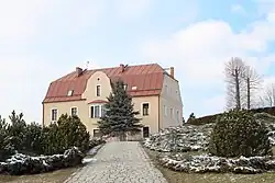 - Die römisch-katholische Pfarrkirche Maria Verkündigung (Kościół parafialny pw. Zwiastowania Najświętszej Maryi Panny) liegt auf einer Anhöhe nördlich des Dorfes. Bereits in der ersten Hälfte des 14. Jahrhunderts befand sich hier eine Kirche, die 1770 im barocken Stil umgebaut wurde. Das Langhaus besitzt eine Stichkappentonne, der Chor ein Kreuzrippengewölbe. Der Glockenturm mit Zwiebelhaube wurde 1750 erbaut. Der Giebel an der Südseite wurde im Stil der Renaissance gestaltet. Die Innenausstattung stammt vorwiegend aus der Umbauzeit von 1770. Der Hauptaltar wurde 1787 gefertigt. Umgeben ist die Kirche von einer Steinmauer aus dem 18. Jahrhundert.[8] Das Kirchengebäude steht seit 1950 unter Denkmalschutz.[9]