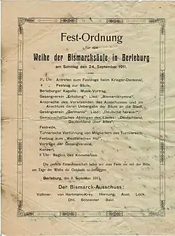 Nach dem Tode Bismarcks im Jahr 1898 erfolgte ein Spendenaufruf der Deutschen Studentenschaft mit dem Ziel, im ganzen Reich Bismarcksäulen zu errichten.[2] Der Vorsitzende des Berleburger Turnvereins, Amtmann Christoph Vollmer (1848–1920), griff in der Jahreshauptversammlung am 12. Januar 1899 die studentische Initiative auf und veranlasste die Versammlung, ein Inserat im Wittgensteiner Kreisblatt aufzugeben, wonach man auch in Berleburg eine Säule zu Ehren Bismarcks errichten wolle und man mit Genehmigung der königlichen Staatsregierung die Bevölkerung um Spenden für das Vorhaben bitte.[3] Die Umsetzung des Bauplans verzögerte sich um viele Jahre, da sich der örtliche Kriegerverein kurz danach um die Errichtung eines aufwändigen Kriegerdenkmals in der Kreisstadt bemühte und man diesem Vorhaben offensichtlich Vorrang einräumte. Hinzu kam, dass der Turnverein gleichzeitig das Ziel einer eigenen Halle verfolgte. Nach Fertigstellung des Kriegerdenkmals im Jahr 1901 und Einweihung der neuen Turnhalle im Jahr 1904 konnte man sich intensiver dem Projekt Bismarcksäule widmen. Dennoch erreichte man erst im Jahre 1911 ein Spendenaufkommen von insgesamt 4000 Mark, mit dem sich das Vorhaben umsetzen ließ.
