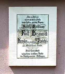| Bismarckstraße 16 | Gedenktafel an das Attentat auf Reichskanzler Fürst Bismarck am 13. Juli 1874 in Bad Kissingen | |