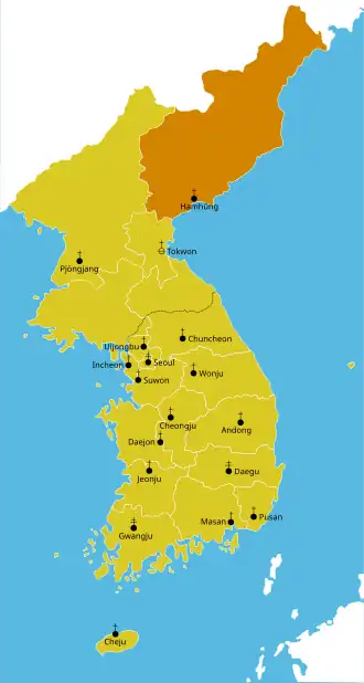Am 12. Juli 1950 wurde der Name noch einmal geändert, da es den Namen Apostolisches Vikariat Hamhŭng annahm. Die Erhebung zum Bistum erfolgte am 10. März 1962 mit der Apostolischen Konstitution Fertile Evangelii semen.