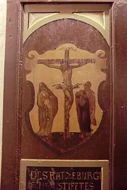 Das Ratzeburger Domkapitel führte ein eigenes Wappen. Es zeigte zuletzt Christus am Kreuz, an dessen Seite Maria und Johannes stehen. Dies war für Jahrhunderte auch das Siegelbild des Kapitels[4] und ist u. a. in der Kirche zu Herrnburg zu sehen.