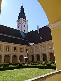 Im Norden der Anlage liegt der ehemalige Klostergarten und heutige Bischofsgarten. In seiner Mitte befindet sich der Neptunbrunnen und im Westen der Gartenpavillon. Östlich von ihm lagen ursprünglich die Wirtschaftsgebäude des Klosters, seit Anfang des 20. Jahrhunderts befindet sich hier die Bezirkshauptmannschaft.