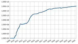 Eine Studie aus dem Jahr 2021 ergab, dass die CO2-Emissionen des Bitcoin-Minings in China, wo vor Mitte 2021 ein Großteil des Proof-of-Work-Algorithmus berechnet wurde, gegen Ende der 2010er Jahre rapide angestiegen sind.[14] Diese Emissionen wurden größtenteils durch nicht erneuerbare Energiequellen angetrieben und es wurde erwartet, dass sie die jährlichen Gesamtemissionen von Ländern wie Italien und Spanien im Jahr 2016 übertreffen würden, was die internationalen Bemühungen zur Eindämmung des Klimawandels beeinträchtigte.[15][16] Es wurde auch festgestellt, dass das Bitcoin-Mining im Jahr 2021 mehr Energie verbrauchte als das Land Neuseeland.[17] Ein formelles Verbot des Kryptowährungs-Minings in China im Mai 2021, das sowohl im September als auch im November wiederholt wurde, führte zur Verlagerung eines Großteils der Mining-Ausrüstung außerhalb Chinas. Dennoch verblieben bis zu 20 Prozent „aller weltweiten Bitcoin-Miner in China, weit entfernt von ihrem Höchststand von etwa 65% bis 75% des globalen Marktes“.[14] Bis Dezember 2021 hatte sich die globale Hashrate größtenteils auf das Niveau vor Chinas Durchgreifen erholt, wobei der Anteil der gesamten Mining-Leistung zunehmend aus den USA (35,4 %), Kasachstan (18,1 %) und Russland (11 %) stammte.[18]