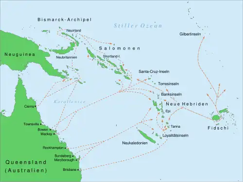 Nach Fidschi wurden zwischen 1877 und 1911 etwa 16.000 Pazifikinsulaner von anderen Atollen und Inselgruppen verbracht.[30] Frühere Transporte sind dokumentiert, jedoch nicht ausreichend statistisch erfasst und publiziert. Beispielsweise erwähnt ein Bericht des neuseeländischen Gouverneurs George Ferguson Bowen, dass schon 1860 die meisten Schiffe, die Fidschi von Neuseeland kommend anliefen, für den Transport von sogenannten Arbeitsimmigranten gechartert worden seien.[31] Über den Bestimmungsort dieser Fahrten lässt sich nur selten Klarheit gewinnen.