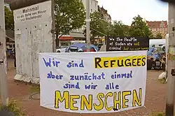Im Jahr 2013 wurden etwa 10.000 Menschen aus der Bundesrepublik Deutschland abgeschoben.[2] Das „Weiter-Leben“ der Betroffenen, die nach einem zum Teil langen Leben in Deutschland mitunter „mitten aus ihrem Alltag gerissen wurden“, blieb nach ihrer Abschiebung jedoch oftmals verborgen. Um ihre Schicksale für die Öffentlichkeit sichtbar zu machen, wurde eine Ausstellung geschaffen, die mittlerweile in zwanzig deutschen Städten zu sehen war. Im Zuge dieser Ausstellung entstand 2013 auch das Buch Blackbox Abschiebung.[1] Im Folgejahr veröffentlichte die Rosa-Luxemburg-Stiftung 2014 ihre mit einem Fragezeichen versehene Schrift Flüchtlinge willkommen - Refugees welcome?[3] Beinahe zeitgleich besetzten im Mai 2014 rund 50 Flüchtlinge aus dem Sudan, die von Abschiebung bedroht werden, mit Zelten den Weißekreuzplatz in Hannover, organisierten friedliche Demonstrationen und traten teilweise in den Hungerstreik, um gegen ihre beabsichtigte Abschiebung zu protestieren.[4] Nachdem sich beispielsweise Belit Onay, Abgeordneter im Niedersächsischen Landtag, sowie andere Mitglieder von Bündnis 90/Die Grünen zu Lage- und Hilfsbesprechungen mit den Sudanesen auf dem Weißekreuzplatz getroffen hatten,[5] fand im gegenüberliegenden Kulturzentrum Pavillon die Vernissage der Ausstellung Blackbox Abschiebung statt, die mit einer Lesung des gleichnamigen Buches und Gesprächen[1] mit den von Abschiebung betroffenen Sudanesen eröffnete.[5]