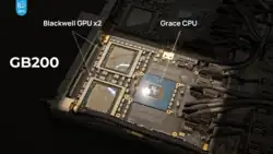 - Für die neue Blackwell GB200 GPU werden zwei Dies zu einem Chip verbunden. Dies ist nötig, da bereits jeder der beiden Dies die produktionstechnisch maximale Größe für eine Fotomaske ausnutzt. Eine GB 200 GPU hat mit 208 Milliarden Transistoren mehr als 2,5 mal so viele Transistoren wie Hopper hatte. Die Herstellung erfolgt auf Basis des 4NP-Prozesses von TSMC.