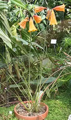 Die Blütenstände sind endständige Trauben mit bis zu 1,5 Metern Höhe und bis zu 20 Blüten. Die Blüten sind zwittrig. Der Blütenstiel entspringt in der Achsel kleiner Tragblätter und besitzt zwei Brakteen. Die sechs Blütenhüllblätter (Tepalen) sind zu einer glockigen Röhre verwachsen, mit sechs breiten Glockenzipfeln. Die Farbe ist rot-gelb, orange oder gelb.