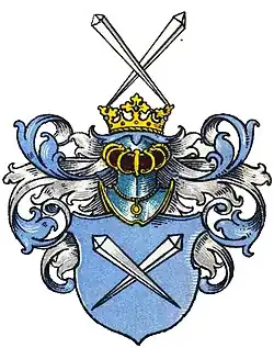 Blasonierung: In Blau zwei silberne mit den Spitzen nach unten gekehrte in Andreaskreuz gesetzte Nägel. Dieselben wiederholen sich über dem gekrönten Helm. Die Helmdecken sind blau-silber.[7]