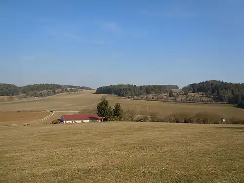 ![]() NSG Blasenberg-Ringelesberg. Rechts die Wacholderheide des Teilgebiets „Blasenberg“, links die Wacholderheide des Teilgebiets „Ringelesberg“. Aufnahmestandort: Nordhang des Kapellenbergs bei Eglingen (Hohenstein). Blickrichtung Ost. | ||