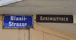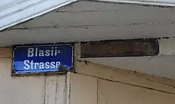 Am Haus befinden sich aufgrund der Ecklage auf die angrenzenden Straßen verweisende Straßenschilder. Bemerkenswert ist dabei ein aus der Zeit nach dem Zweiten Weltkrieg erhaltenes Schild Блазиштрасе, welches in kyrillischer Schrift den Namen Blasiistraße wieder gibt. Das Schild geht auf eine Forderung der sowjetischen Besatzungsmacht zurück, wonach neben Orts- und Straßennamen auch jeweils kyrillische Beschriftungen zu setzen waren, um Angehörigen der Besatzungstruppen die Orientierung zu erleichtern. Während vergleichbare Schilder andernorts später entfernt worden waren, wurde das Schild an der Blasiistraße 16 erst nach einer Fassadenreinigung wieder sichtbar.[7] Zwischenzeitlich war es jedoch wegen einer Verunreinigung nur schwer lesbar.