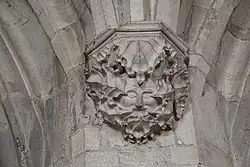 Pforzheim, St. Michael, Nordkapelle, Schlussstein mit Blattmaske und weiterem Blattmaskenkopf, um 1320 -