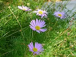 Die Blüten sind typischerweise fünfzählig. Der Kelch ist komplett reduziert und es gibt bei den Einzelblüten weder einen Pappus noch ein Spreublatt. Bei den blau-violettfarbenen Zungenblüten laufen die verwachsenen Kronblätter in fünf Kronblattzipfel aus. Die Röhrenblüten sind gelb und ebenfalls fünfzipflig. Die Staubbeutel der fünf Staubblätter des Androeceums sind zu der für die Korbblütengewächse typischen Staubbeutelröhre verwachsen, die Filamente sind frei. Innerhalb der Staubbeutelröhre befindet sich der Griffel mit der zweiteiligen Narbe. Das Gynoeceum besteht aus zwei verwachsenen und unterständigen Fruchtblättern. Die Frucht ist eine Achäne.