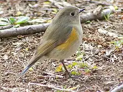 Das Weibchen ist oben olivbraun, unten heller und hat einen bläulichen Bürzel und Schwanz sowie orangefarbene Flanken. Die Jungvögel ähneln jungen, gefleckten Rotkehlchen.