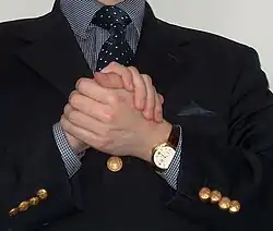 Der Blazer ist eine sportliche Jackenform für Damen, Herren und Kinder, ohne verbindliche Regeln des Schnitts, einreihig oder zweireihig, mit steigendem oder fallendem Fasson (Reversform). Ein wesentliches Stilelement traditioneller Blazer ist der Wappenschild (frz. Blason) auf der Brusttasche.[1] Der klassische Blazer unterscheidet sich in den ursprünglicheren Formen von Sakko oder Anzugjacken außerdem vor allem durch glänzende Metallknöpfe und durch die Verwendung von Farben und Stoffen aus der Tradition von Uniformen.