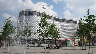 Im Neubau der Blechbüchse befinden sich heute auf vier Geschossen Geschäfte.[23] Das erhaltene Stück historische Sandsteinfassade ist entgegen den früheren Plänen nicht von außen, sondern nur vom Inneren des Gebäudes einsehbar.
