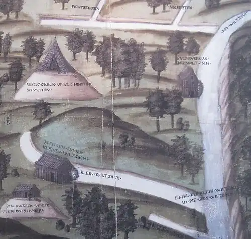 - ↑ Bildkarte der Bergwerke Vordere und Hintere Schmochau um 1520, in den musealen Räumen des Bergarchivs im Schloss Freudenstein in Freiberg.