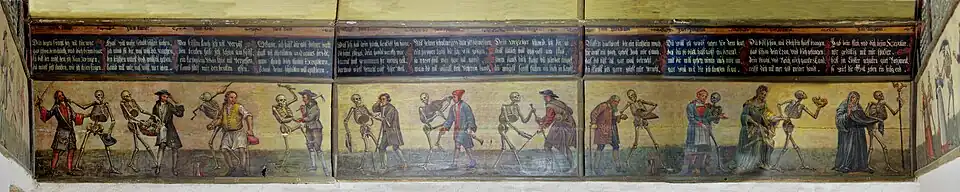 Auf dem umlaufenden Bilderfries tanzt der als Skelett dargestellte Tod mit seinen Opfern in allen Altersstufen, ohne auch nur einen zu verschonen. Von der Tradition abweichend lockt er bereits in der ersten Szene ein Kind mit einem roten Apfel zum Tanz. Es folgen die Würdenträger des geistlichen Standes: Papst, Kardinal, Bischof, Abt und Priester. Anschließend treten die weltlichen Standespersonen auf: Kaiser, König, Herzog, Edelmann, Amtmann, Jurist, Doktor, Reicher Mann, Kaufmann, Bürger, Junggeselle, Soldat, Krämer, Koch, Bauer, Tagelöhner, Spielmann, Blinder und Alter Mann. Den Schluss bilden die Frauen: Jungfrau, Kaiserin, Äbtissin, Freifrau, Stadtfrau, Bäuerin, Pilgerin und Altes Weib. Die Komposition der Bilder legt die Vermutung nahe, der Künstler habe sowohl die Vorbilder in Basel (Basler Totentanz) und Kientzheim (Haut-Rhin) (Totentanz von Kientzheim) als auch die „Bilder des Todes“ von Hans Holbein d. J. gekannt.