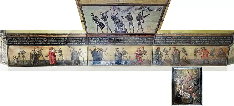 Der Totentanz wurde in Ölfarben rundum an den Wänden und in den Ansätzen des holzverschalten Tonnengewölbes der Kapelle ausgeführt. Über dem eigentlichen Tanz der Paare ist auf der Südseite eine Eingangsmusik dargestellt: „Sechs Sensenmänner spielen mit merkwürdigen, makabren Instrumenten die Weise vom Tod. Der Geiger, dessen Bogen ein Sensenblatt ist, spielt die Melodie, mit Arm- und Oberschenkelknochen schlägt der Trommler (mit dem Gerippe an der Kesselpauke) den Rhythmus und aus der Trompete erklingt nach dem Spruchband die Mahnung: Mein Trompetenschall bringt Freud oder Truebsal in Ewigkeit. Krummhorn und Zinken dienen als Begleitmusik“ (Hermann Trenkle).