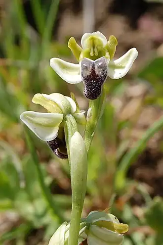 Die zwittrige Blüte ist zygomorph und dreizählig. Die breit eiförmigen bis elliptischen Kelchblätter sind in der Regel weißlich bis grünlich gefärbt, selten erscheinen sie auch rötlich. Das mittlere Kelchblatt ist stark nach vorn gebogen, während die seitlichen rechtwinklig zur Seite weisen. Die kahlen, zungenförmigen Kronblätter erscheinen grünlich-gelb bis bräunlich, sie sind nach vorn gebogen und erscheinen am Rand wellig. Die braune Lippe weist im hinteren weiß behaarten Drittel eine Längsfurche auf. Die drei vorderen Lappen sind dunkel behaart. Das flächige Mal sitzt im Bereich der Furche und wird durch sie gegliedert, es erscheint graubraun bis grauviolett und weist vorn einen undeutlichen Rand auf. Die Lippe ist knieförmig gebeugt.[1]
