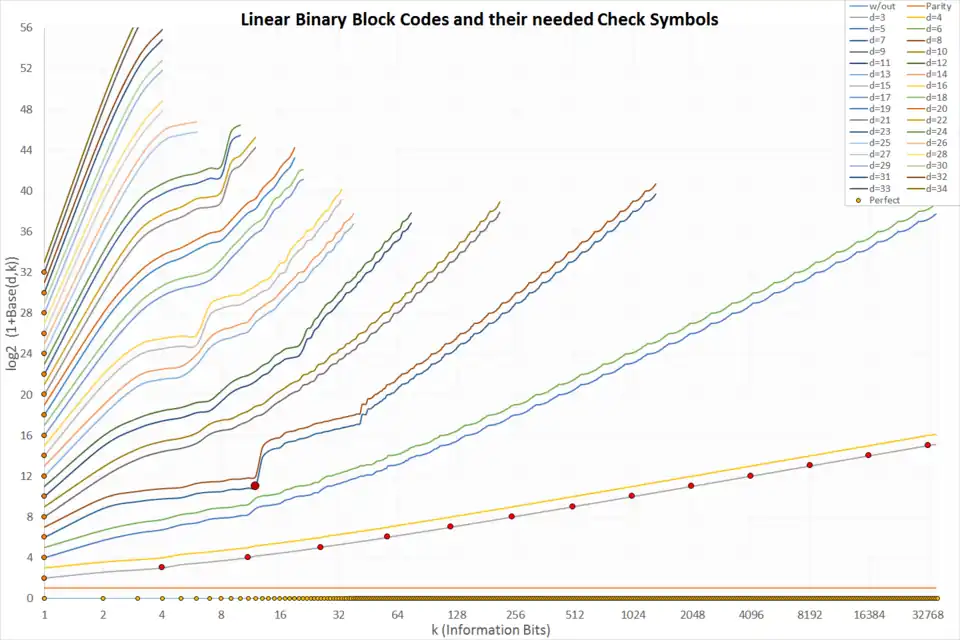 - dunkelorange, auf der Linie für d=3: klassische, perfekte Hamming-Codes