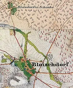 1837 wurden in Bloischdorf die gutsherrlichen Renten abgelöst: die Gutsherrschaft erhielt eine Entschädigung in Höhe von 1.716 Reichstalern und 20 Groschen.[19] 1841 wurde der Rittergutsbesitzer von Reinsperg auf Bloischdorf zum Feuer- und Wegepolizei-Commissarius für den 1sten Spremberger Bezirk ernannt.[20] Im Urmesstischblatt 4452 Spremberg von 1846 ist südlich des Ortskerns eine Windmühle eingetragen. Im Urmesstischblatt 4352 Sellessen ist Bloischdorf-Kolonie als Bloischdorfer Schänke eingetragen.