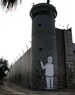 Blu bemalte die 25 Kilometer lange und bis zu acht Meter hohe Betonmauer bei Bethlehem mit einem weiten Feld von Baumstümpfen, in dem ein Weihnachtsbaum steht, der von einer Mauer eingekreist ist. Ein weiteres Bild Blus zeigte einen Weihnachtsmann, der mit einem Bagger Mauerstücke beseitigt.[88] Ferner malte er einen kriechenden Riesen, der Dollarnoten in eine Gruppe Soldaten bläst.[89] An einem Wachturm hinterließ er eine Figur, die naiv versucht, den Turm einzureißen, indem sie mit einem Finger in den Beton drückt – nicht ganz ohne Erfolg, denn im Beton zeigen sich erste Risse.[90]