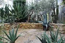 Im Palmenhaus wird auf 700 m2 in drei Bereichen die Flora, in kleinem Umfang auch die Fauna, aus drei Klimazonen präsentiert. Der zentrale Bereich, der auch einen Teich und einen Wasserfall umfasst, zeigt Pflanzen aus tropischen Regionen, die beiden seitlichen Trakte einerseits Pflanzen des Mittelmeerraumes, anderseits den sog. Palmenhain.[11]