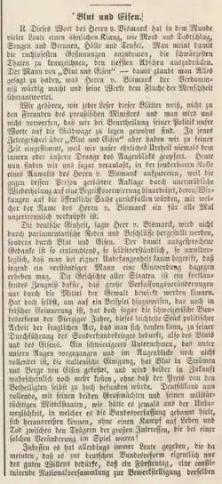 „Ich kann nicht dafür, daß ich damals nicht verstanden worden bin; ich habe mich namentlich in den bekannt gewordenen, und zwar nicht ganz richtig bekannt gewordenen Äußerungen, die durch die Worte ‚Blut und Eisen‘ gekennzeichnet waren, recht deutlich darüber ausgesprochen, deutlicher fast vielleicht, als es gut war damals. Es handelte sich um militärische Fragen, und ich hatte gesagt: Legt eine möglichst starke militärische Kraft, mit anderen Worten möglichst viel Blut und Eisen in die Hand des Königs von Preußen, dann wird er die Politik machen können, die Ihr wünscht; mit Reden und Schützenfesten und Liedern macht sie sich nicht, sie macht sich nur durch ‚Blut und Eisen‘. (Bravo! rechts.) Das ist die Sache. Ich wäre vielleicht verstanden worden, wenn ich nicht zuviel Rivalen auf diesem Gebiete, Deutschland herzustellen, damals gehabt hätte. (Heiterkeit.)“[19]