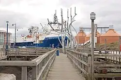 Der Quayside wurde ebenfalls umfassend saniert und in eine Freifläche umgewandelt, deren Herzstück eine Skulptur ist, die an die Industrie erinnert, die hier einst florierte.[19] Auf der gegenüberliegenden Flussseite stehen die neun Windturbinen des Windparks Blyth Harbour, die 1992 entlang des East Pier errichtet wurden. Im Jahr 2000 kam der Offshore-Windpark Blyth hinzu, der aus zwei Turbinen besteht, die 1 km weit draußen auf dem Meer stehen. Dies waren die ersten beiden Offshore-Windturbinen in Europa. Diese Windturbinen wurden alle stillgelegt, wobei die letzten beiden 2019 entfernt wurden.[20] Ein neuer Windpark weiter vor der Küste, bestehend aus fünf Turbinen, wurde 2017 in Betrieb genommen.[21][22] Im September 2023 vergab RWE den Offshore-Konstruktionsauftrag für das Teilprojekt Sofia des Offshore-Windpark Dogger Bank an die Betreibergesellschafts des Hafens von Blyth.[23][24]