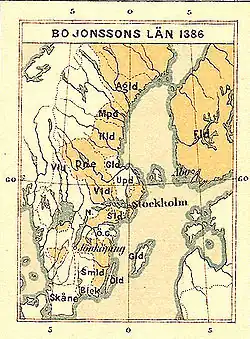 Bo Jonsson entstammte dem Adelsgeschlecht der Grip. Seine Güter, die er hauptsächlich durch Pfandleihe erhielt, umfassten in ihrer größten Ausdehnung 1/3 von Schweden und gesamt Finnland. Es war offensichtlich, dass Bo die großen Geldmengen, die er als Pfand beim Königshaus hinterlegte, nicht aus eigener Tasche bezahlte. Aus seinem Testament war ersichtlich, dass hinter ihm eine Reihe einflussreicher Unterstützer stand. Diese halfen Bo Jonsson überwiegend aus politischen Gründen. Es sollte eine Machtbasis entstehen, welche die mecklenburgische Dynastie daran hindern sollte, sich weiter in Schweden auszubreiten. Aus diesem Grund trennte Bo Jonsson in seinem Testament rein private Güter, wie zum Beispiel Schloss Gripsholm und Schloss Bjärka-Säby, strikt von den Besitzungen, die er aus politischen Gründen verwaltete.