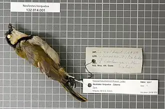 - ↑ R. J. Dowsett, Storrs L. Olson, M. S. Roy, F. Dowsett-Lemaire: Systematic status of the Black-collared Bulbul Neolestes torquatus. Ibis 141, 1999, S. 22–28