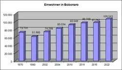 In der Gemeinde leben 106.638 Menschen (2022,[2] 2011: 96.709[12]). Dabei sind die Verwaltungsämter Bobonaro und Maliana dichter besiedelt. In der Stadt Maliana leben 13.078 Menschen. Von den Einwohnern der Gemeinde sind 53.704 Männer und 52.935 Frauen. Auf 101 Männern kommen 100 Frauen[2] Zwischen 2015 und 2022 lag das jährliche Bevölkerungswachstum bei 1,2 %. Der Landesdurchschnitt liegt bei 1,8 %.[2] Zwischen 1990 und 2004 wuchs die Zahl der Einwohner jährlich nur um 0,16 %. Allerdings wanderten viele Einwohner in andere Landesteile ab, vor allem in die Landeshauptstadt Dili. Über 8000 Einwohner Dilis im Jahr 2004 wurden in Bobonaro geboren.[13]