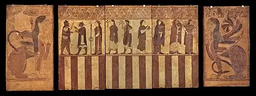 Zunächst war unklar und umstritten, welche Ereignisse durch die beiden Personengruppen dargestellt werden sollten. Man vermutete, dass die beiden Männer auf der linken Seite Priester charakterisieren, vielleicht einen Haruspex, der Blitze deutete und aus den Eingeweiden von Opfertieren weissagte, und einen Augur, der den Flug und die Laute der Vögel und anderer Tiere deutete. Die weibliche Figurengruppe wurde als Trauerzug aus dem Totenkult oder als Szene der Verehrung einer Göttin interpretiert, die der Prozession voranschreitet.