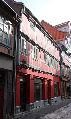 Das dreigeschossige Fachwerkhaus entstand in der Zeit um 1650. Die Stockschwellen des Gebäudes sind mit Pyramidenbalkenköpfen, Schiffskehlen, profilierten Knaggen und Füllhölzern verziert. Die Fachwerkfassade präsentiert sich heute in einem kräftigen roten Farbton.