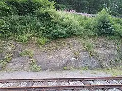 Das Bodendenkmal Böschung südlich des ehemaligen Bahnhofs Hüinghausen liegt am Bahnhof Hüinghausen in Herscheid, wo der Märkische Museums-Eisenbahn e. V. (MME) seinen Stützpunkt für eine 1000-mm-Museumsbahn mit Namen Sauerländer Kleinbahn an der 1969 stillgelegten Bahnstrecke Plettenberg–Herscheid betreibt. Das Bodendenkmal wurde am 27. Juli 2004 ausgewiesen. Im Oktober 2020 legte der Bauhof der Gemeinde Herscheid Gesteinsschichten aus dem Übergang zwischen Silur und Devon, also aus einer Zeit vor etwa 420 Millionen Jahren, über eine Länge von 150 Metern und eine Höhe von 3 Metern frei. Am Bahnhof stellte man eine Infotafel mit QR-Code zu weiteren Infos auf, wobei auf der Südseite der Infotafel Infos zur Sauerländer Kleinbahn stehen.[1]