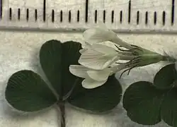 Die wechselständig angeordneten Laubblätter sind in Blattstiel und Blattspreite gegliedert. Die Blattspreite ist dreiteilig gefiedert. Die Fiederblättchen sind bei einer Länge von 8 bis 12 Millimetern verkehrt-herzförmig.