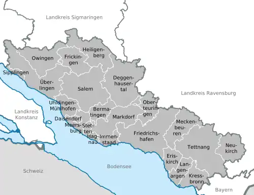 Auch gibt es im Kreis acht Verwaltungsgemeinschaften mit Sitz in Friedrichshafen, Überlingen, Tettnang, Markdorf, Meersburg, Salem, Kressbronn und Heiligenberg.