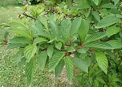 Die gegenständig an den Zweigen angeordneten Laubblätter sind in Blattstiel und Blattspreite gegliedert. Der rote Blattstiel ist bis zu 2 Zentimeter lang. Die einfache Blattspreite ist bei einer Länge von 4 bis 10 Zentimetern länglich-elliptisch oder lanzettlich. Die Blattoberseite ist matt tiefgrün und runzlig. Der Blattrand ist gesägt. Es sind sechs bis neun tief eingeprägte Nervenpaare vorhanden. Beim Austrieb sind die Blätter rötlich überhaucht und im Herbst färben sie sich in rotbraunen bis violetten Farbtönen.[2]