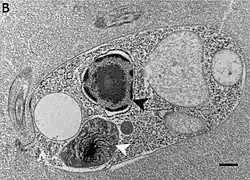 - ↑ a b Jane Harmer, Vyacheslav Yurchenko, Anna Nenarokova, Julius Lukeš, Michael L. Ginger: Farming, slaving and enslavement: histories of endosymbioses during kinetoplastid evolution. In: Cambridge University Press: Parasitology, Band 145, Nr. 10, S. 1311–1323, September 2018; doi:10.1017/S0031182018000781, PMID 29895336, Epub 13. Juni 2018 (englisch). Siehe u. a. Fig. 2.