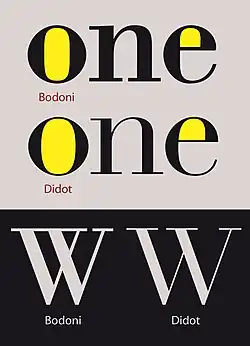 Von der Didot (oder, auch hier, besser: den unterschiedlichen Didot-Varianten) unterscheidet sich die Bodoni durch die (in der Regel) etwas kräftigeren Haarstriche sowie eine etwas weniger geometrische Ausführung der Zeichenproportionen. Einige Merkmale variieren – je nachdem, um welche Bodoni-Variante es sich konkret handelt. Einige warten an der Zeichen-Oberkante mit flachen Abstrichen auf, andere mit dachförmigen, leicht geschrägten. Das Textbild wird stark vom Wechsel der Strichkontraste bestimmt und der daraus resultierenden Betonung der Vertikalen – ein Grund, warum sie die der Autor Hans Peter Willberg in seinem Klassifikationsmodell den statischen Schriften zurechnet.[6]