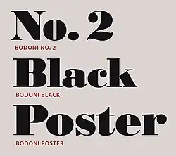 - ↑ siehe Poster Bod., Bodoni 2 U., Bodoni Black und Battista, Fonts in Use, aufgerufen am 30. Januar 2024 (englisch)