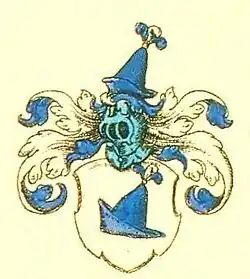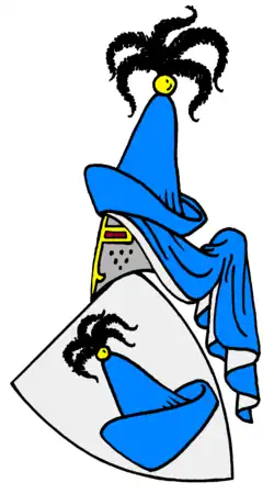 In Silber ein oben mit einer goldenen Kugel und fünf schwarzen Hahnenfedern besteckter blauer Spitzhut. Auf dem Helm mit blau-silberner Decken ein Spitzhut wie im Schild.[6] Im Siebmacher von 1605 sind statt der Hahnenfedern drei (blau, silbern, blau) Straußenfedern dargestellt.