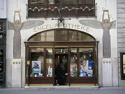 Das Wohnhaus wurde 1901–1902 von Oskar Laske und Viktor Fiala errichtet und zählt zu den wichtigsten Bauten des floralen und geometrischen Jugendstils in Wien. Es besitzt ein breites segmentbogiges Portal mit der Inschrift Engel Apotheke. Darüber befindet sich ein großes querrechteckiges französisches Fenster mit floralem Balkongitter. Portal und Fenster werden durch zwei auffällige Mosaike flankiert, die zwei Engel mit Schlange darstellen, die eine Schale emporhalten, in die von oben Medizin herabfließt. Über dem Fenster befindet sich außerdem ein bekrönender Fries mit Sonnenblumen, Amphoren und Schlange. Die Fenster der Obergeschoße sind durch in die Wandfläche eingeschnittene farblich differenzierte Fensterrahmungen gekennzeichnet. Über einem Konsolgesims erhebt sich das secessionistische Attikageländer.