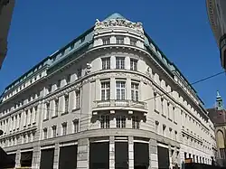 Das dreiseitig freistehende neoklassizistische Bürohaus zwischen Tuchlauben und Seitzergasse wurde 1909–1910 von Ernst Spielmann und Alfred Teller erbaut. Der dreigeschoßige Sockel des Gebäudes ist mit großteils original erhaltener Verkleidung aus schwarzem Glas gestaltet. Darüber trennt ein durchlaufender Balkon mit Gitter die Wohngeschoße mit dekorierten Majolikafeldern vom Geschäftsbereich ab. Das Dachgeschoß ist metallverkleidet. Im Inneren befinden sich noch originale Geländer im Stiegenhaus. Das Gebäude steht unter Denkmalschutz.