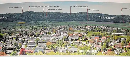 - Die Burg Kastenbühl (587,4 m) befindet sich südsüdwestlich von Bohlingen auf einem Nordsporn des Schiener Berges (715,6 m).