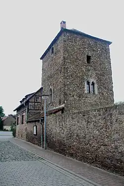 Der aus Bruchstein errichtete Turm ist quadratisch und mehrgeschossig. Im Keller befindet sich ein Kappengewölbe, das darüber liegende Stockwerk hat ein Tonnengewölbe, die zwei weiteren verfügen je über etwa 1660 eingezogene Flachdecken. Ursprünglich befand sich im zweiten Obergeschoss der Eingang zum Turm; noch heute mit Spitzbogen vorhanden. Dieses frühere, repräsentative Wohngeschoss (Rittersaal) ist mit Kamin und Schmuckfenstern versehen. Hier befinden sich zwei Biforenfenster mit Kleeblattbögen. Dank Tonnengewölbe und Sperrriegelverschlüssen zu den unteren Geschossen war es sicherer Zufluchtsort.[5] Das überdachte Obergeschoss verfügte ursprünglich über Zinnen. Am Wohnturm sind außerdem Schlitzfenster und Reste eines Aborterkers erkennbar.[6] An der Ostseite des Turmes ist ein im 19. Jahrhundert errichtetes Gebäude in Bruchstein mit Fachwerkaufsatz angelehnt, es diente zunächst als Speicher und wird heute bewohnt.