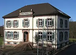- Die Pfarrkirche St. Hilarius wurde 1840 von Hans Voß im Weinbrenner-Stil errichtet.