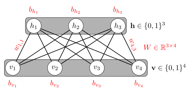 Das „restricted“ (englisch für „beschränkt“) bezeichnet die Tatsache, dass weder die sichtbaren Einheiten noch die versteckten Einheiten innerhalb dieser Gruppen untereinander verbunden sind. Allerdings sind die sichtbaren Einheiten mit den versteckten Einheiten vollständig verbunden. Sie bilden also einen bipartiten ungerichteten Graphen. Dies ist im Folgenden dargestellt:
